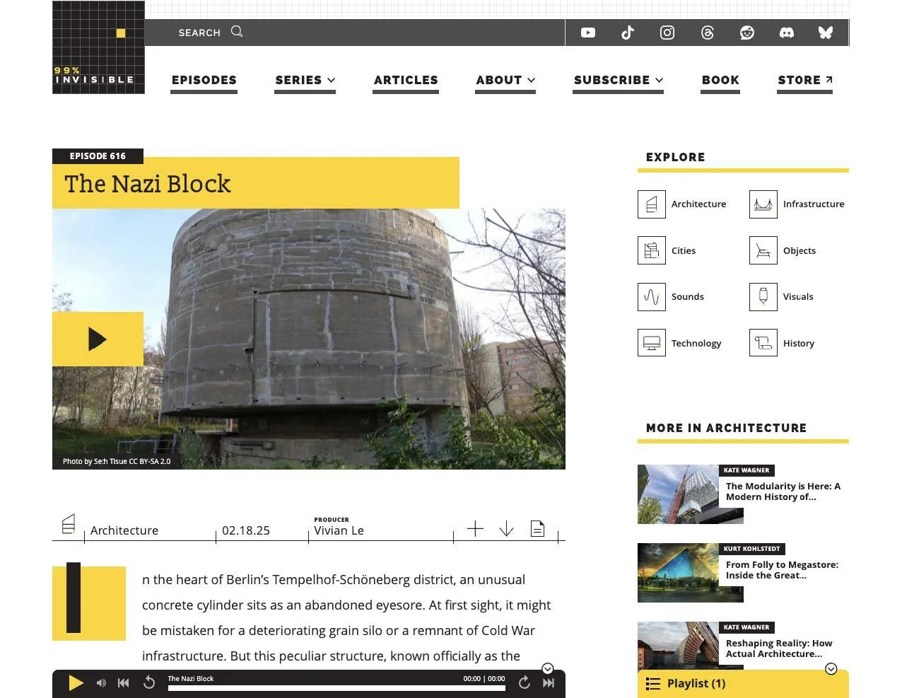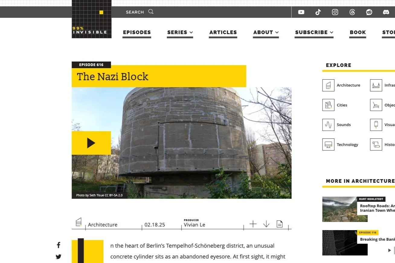 Podcast: ”The Nazi Block,” with Magnus Brechtken, Michael Richter, Despina Stratigakos, et. al., 99% Invisible, produced by Vivian Le, edited by Joe Rosenberg, mixed by Martín Gonzalez, music by Swan Real, George Langford, and APM, translations by Sara Zarreh Hoshyari Khah, 2025 (podcast with ~1 million listeners per episode) [Spotify]
