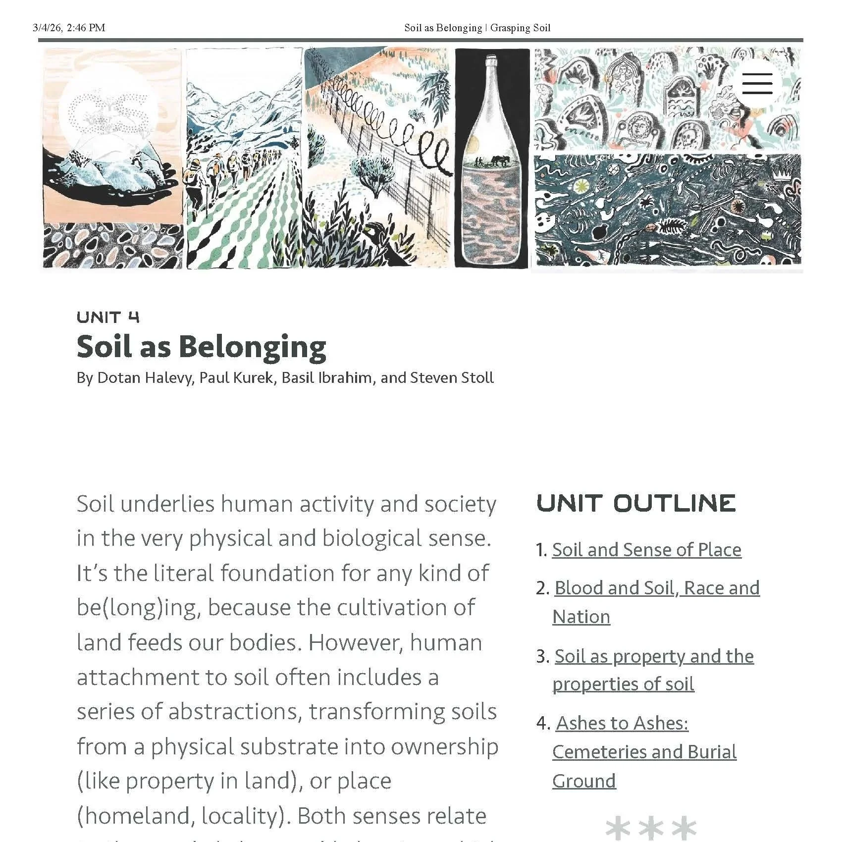 Syllabus (in English): »Soil as Belonging,« with Dotan Halevy, Basil Ibrahim, and Steven Stoll, illustrated by Natasha Russell, web design by Brian Jones